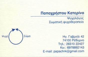 customer tabsΕπικοινωνίαΨυχοθεραπεία : είναι μια νέα εκπαίδευση που βοηθά το άτομο να ξεκαθαρίσει τις πεποιθήσεις του και να επαναπροσδιορίσει προσωπικό δρόμο στη Ζωή.Η Σωματική Ψυχοθεραπεία: είναι ψυχανάλυση σε συνδιασμό με τις 'αλήθειες' που έχουν καταγραφεί στο κορμί στο πέρασμα του χρόνου.Το σώμα είναι το σκηνικό που η ψυχή 'παίζει' τα δράματα της. Όλα τα θέλω τα δάκρια που δεν χύσαμε, τα λόγια που δεν ξεστομίσαμε βυθίστηκαν στο "είναι" μαςκαι μέσω της ασθένειας βρήκαν το δρόμο να ζητήσουν κάθαρση.Το σωμα έιναι η επιφάνεια προβολής της ψυχής μας. ΨυχολόγοιΥγείαΗγουμένου Γαβριήλ 42, ΡέθυμνοΡΕΘΥΜΝΟ ΡΕΘΥΜΝΟΥΡΕΘΥΜΝΟΚΡΗΤΗ 2831092427 6978892143papachrk@gmail.com Το προτείνω (έχει προταθεί 0 φορές) ΦωτογραφίεςFacebook LikeShare on FacebookTweet Widget